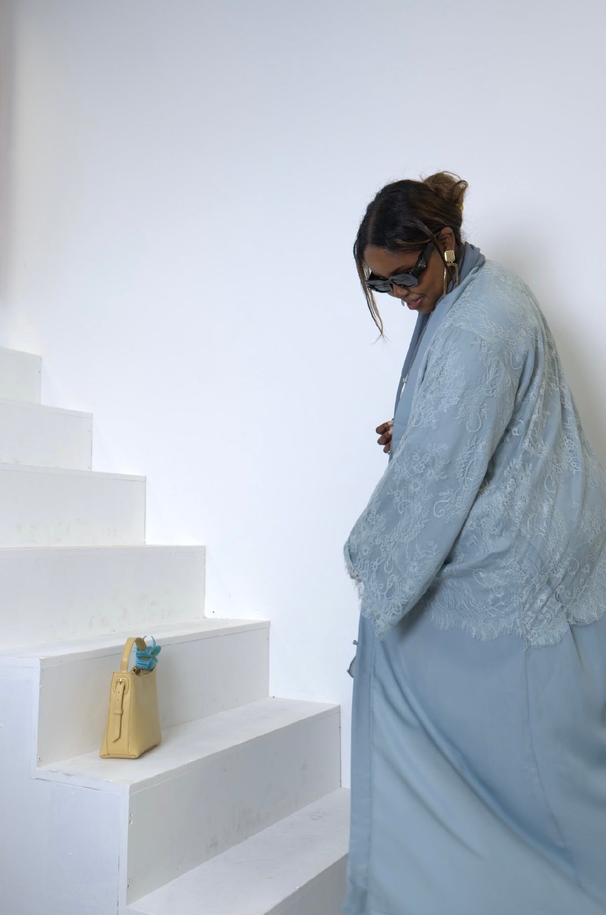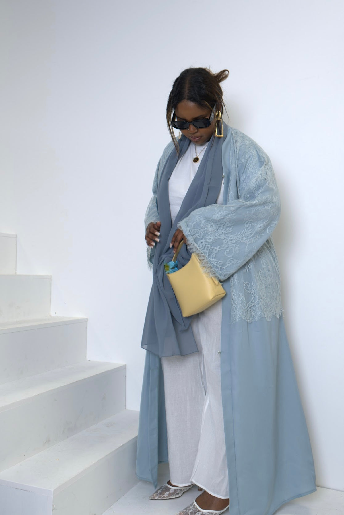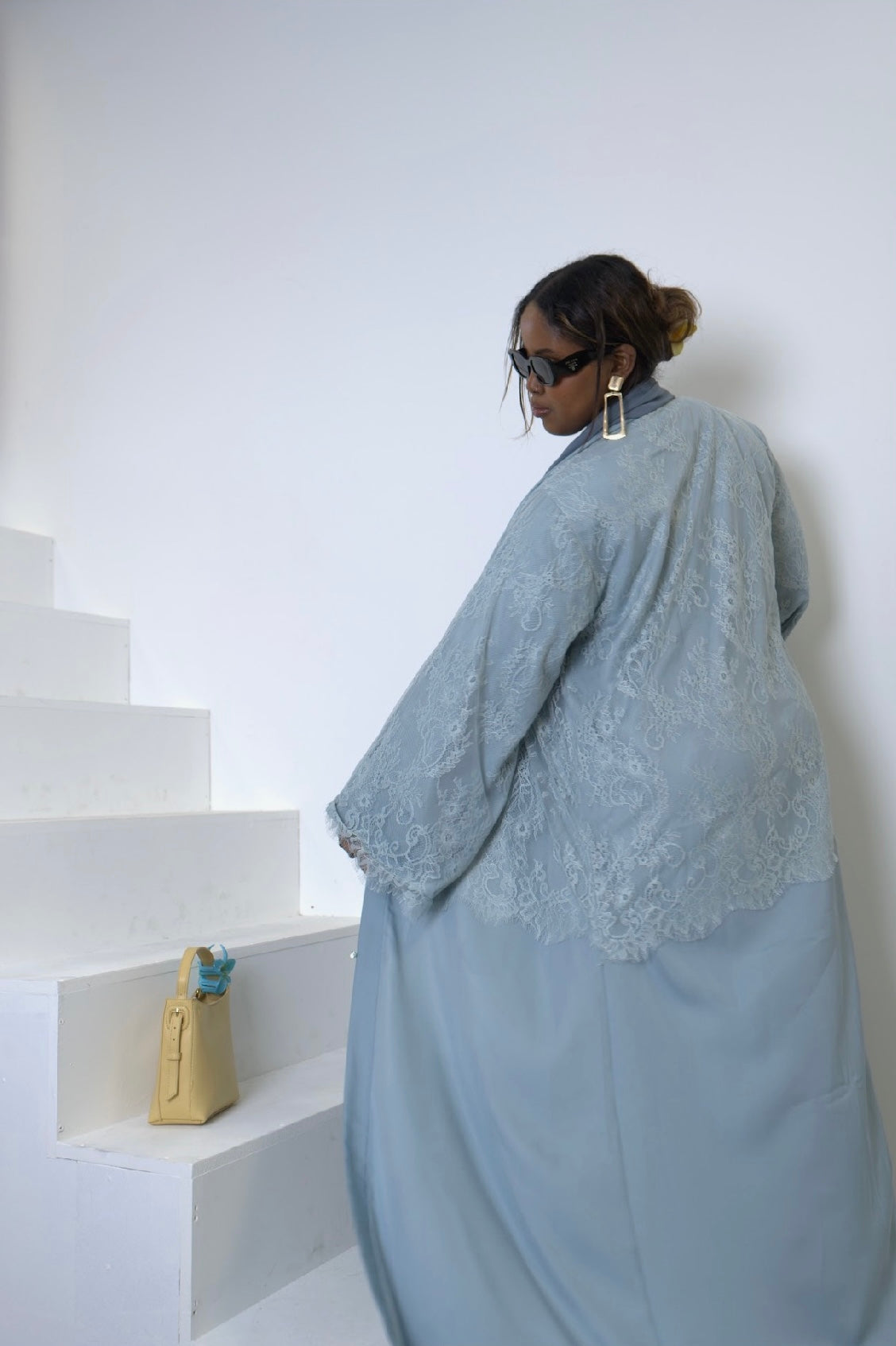 Our beautiful model is wearing the Sky Blue in size 58, check size chart for reference. This beautiful lace abaya comes with a matching scarf making it perfect for all occasions.