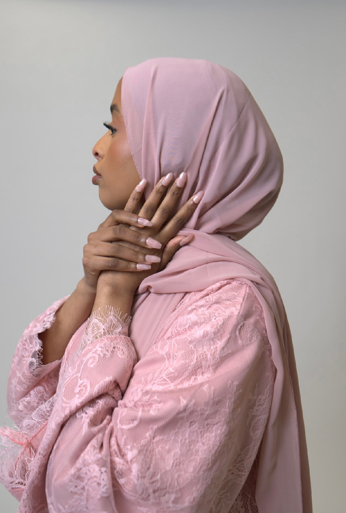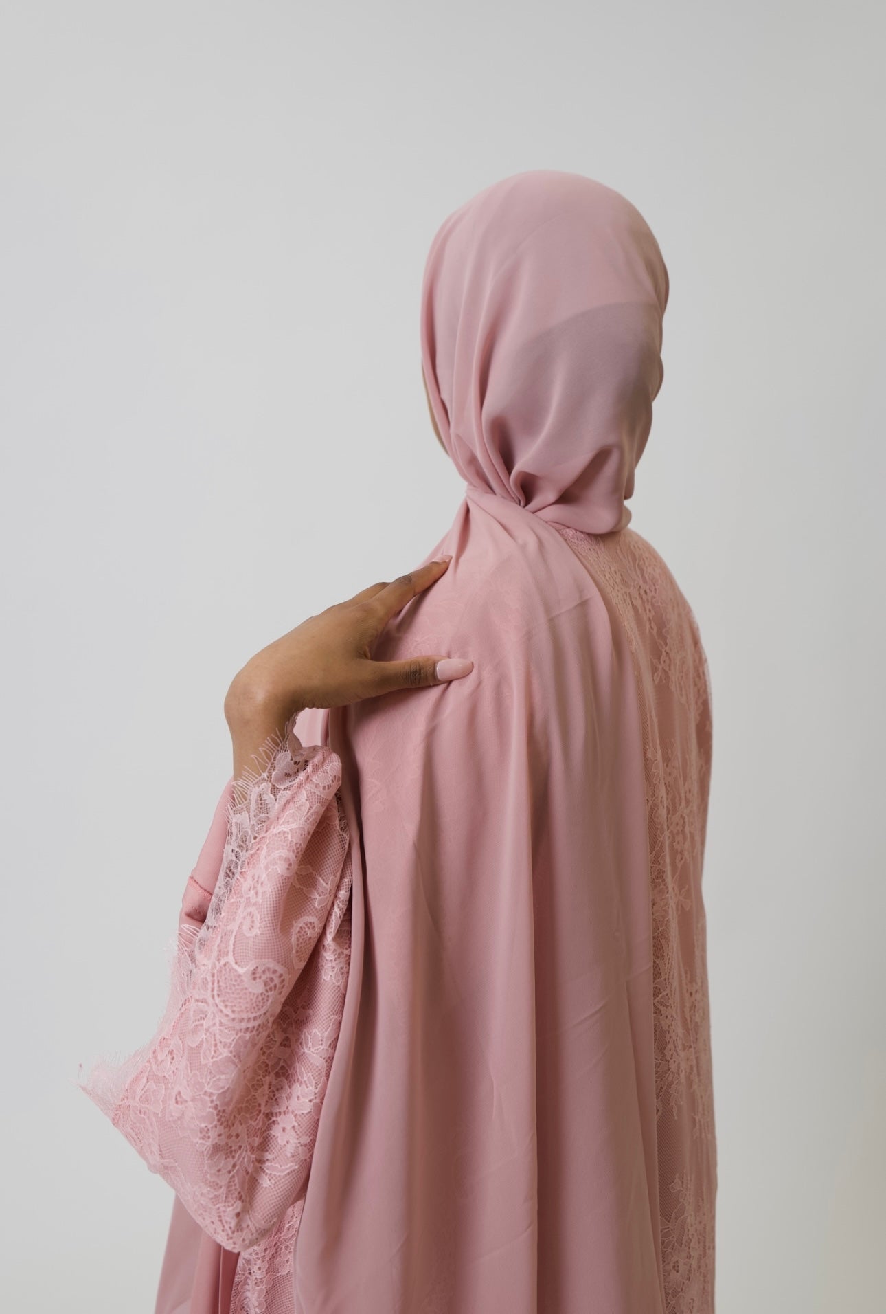 Our beautiful model is wearing the Soft Rose in size 56 and she is 5’5, check size chart for reference. This beautiful lace abaya comes with a matching scarf making it perfect for all occasions.