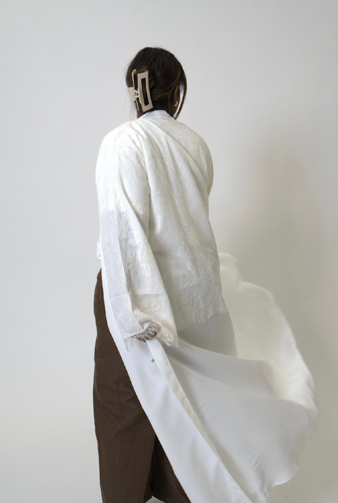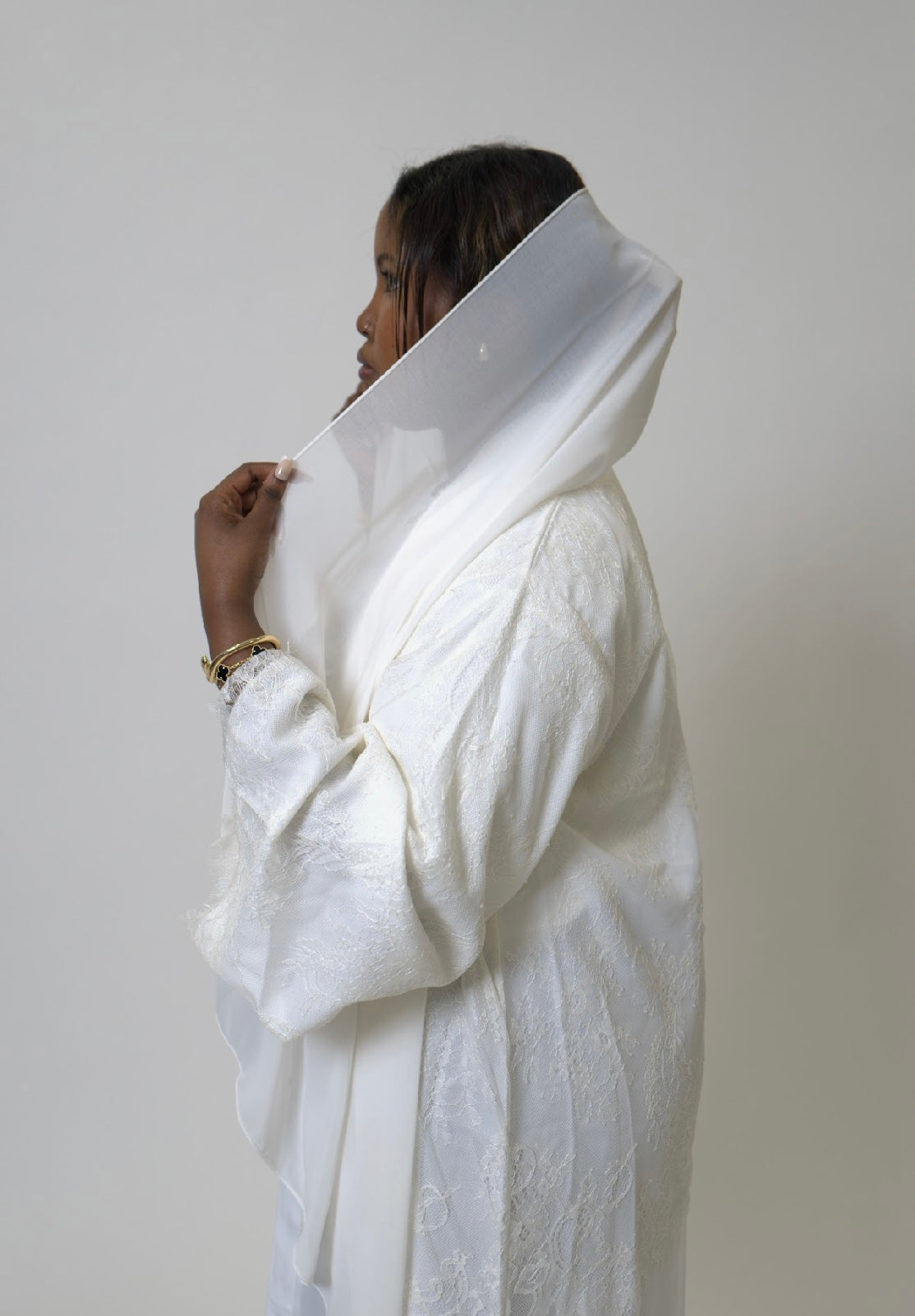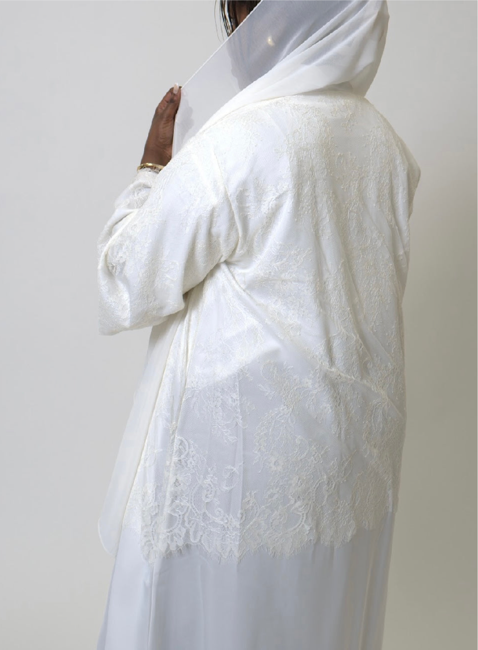 Our beautiful model is wearing the White Pearl in size 58, check size chart for reference. This beautiful lace abaya comes with a matching scarf making it perfect for all occasions.
